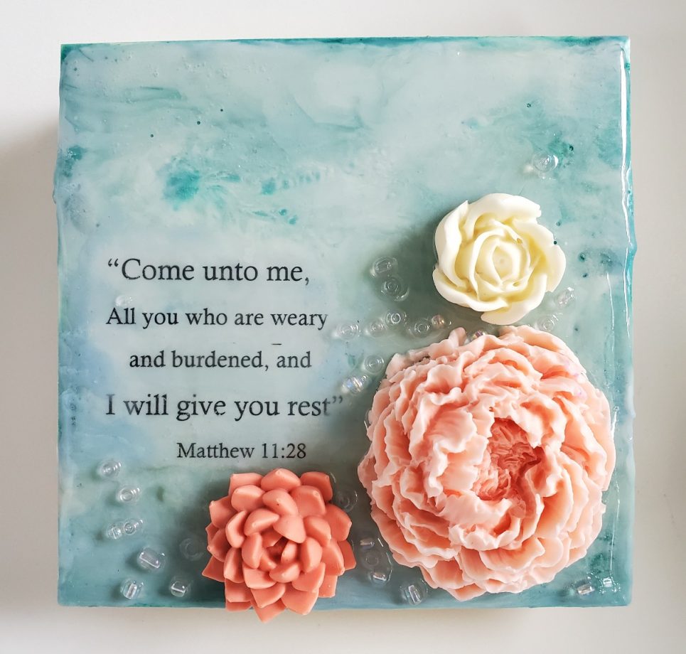 5.5″ x 5.5″ Encaustic with mixed media and resin on wood board